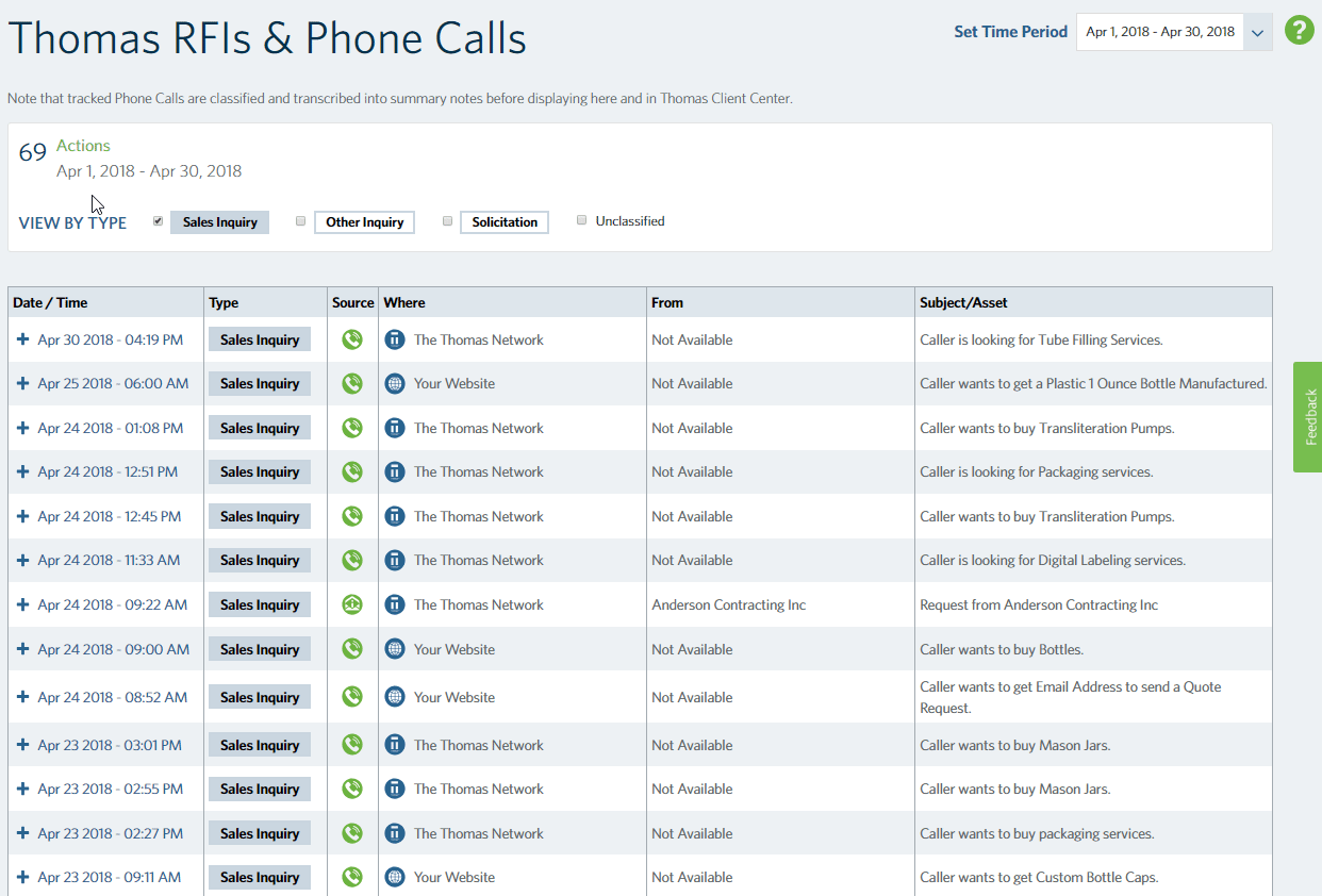 RFIs and Phone Calls from users that occurred either on the Thomas Network or your own site — available to Thomas clients only.